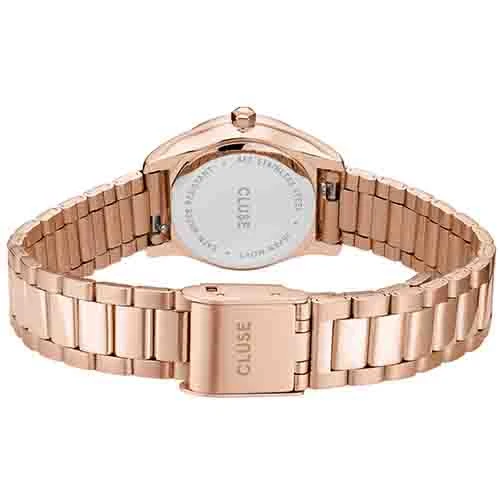 Conçue avec un cadran noir, un boîtier de 25 mm de couleur or rose et un bracelet à 3 maillons.