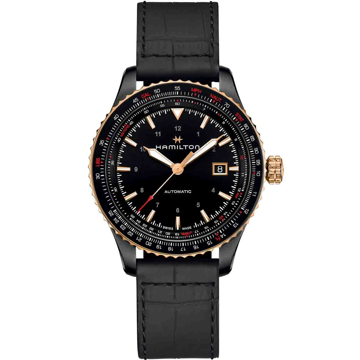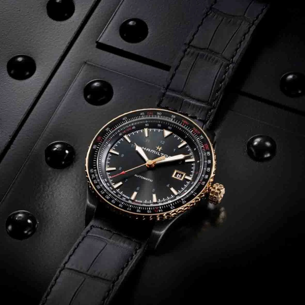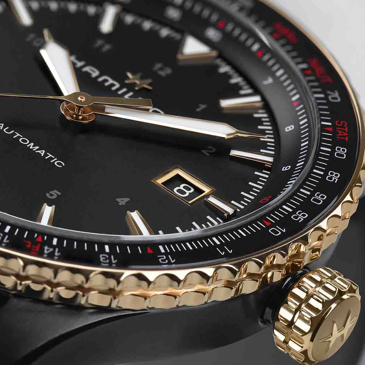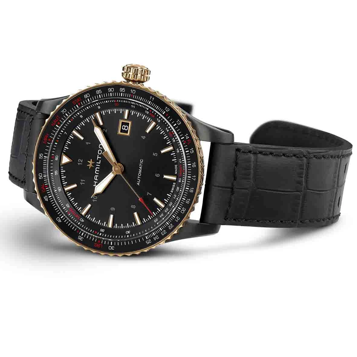 le cadran noir épuré de 42 mm renferme le mouvement à remontage automatique H-10 doté d’une réserve de marche de 80 heures.