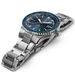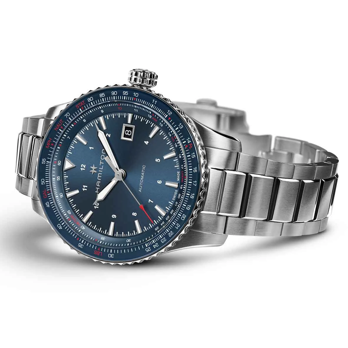 Laissez-vous inspirer par le superbe cadran bleu de la Khaki Aviation Converter Automatic et visez toujours plus haut. Les pilotes et les aventuriers urbains peuvent effectuer des opérations et des conversions essentielles en vol en utilisant sa lunette « règle à calcul » bleue assortie.