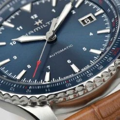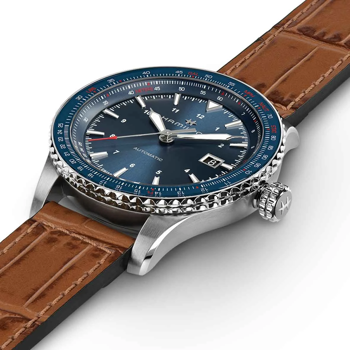 Laissez-vous inspirer par le superbe cadran bleu de la Khaki Aviation Converter Automatic et visez toujours plus haut. Les pilotes et les aventuriers urbains peuvent effectuer des opérations et des conversions essentielles en vol en utilisant sa lunette « règle à calcul » bleue assortie.