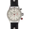 LogĂ©e dans un boĂ®tier de 41 mm en acier inoxydable montĂ© sur un bracelet en cuir marron, elle est Ă©quipĂ©e d’une couronne vissĂ©e qui protège le mouvement de toutes les intempĂ©ries.