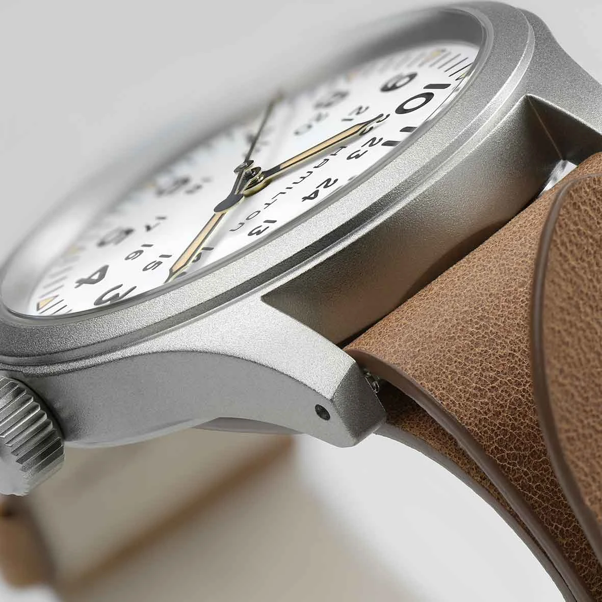 Boîtier en acier inoxydable de 38 mm, trois aiguilles, cadran sombre avec chiffres clairs, index triangulaires avec Super-LumiNova® radium vintage et bracelet NATO résistant : la nouvelle Khaki Field Mechanical est une fidèle reproduction de son ancêtre des années 60, véritable hommage à l’héritage militaire d’Hamilton. Le boîtier de cette montre militaire originale est désormais traité PVD « terre », une couleur propre à Hamilton.