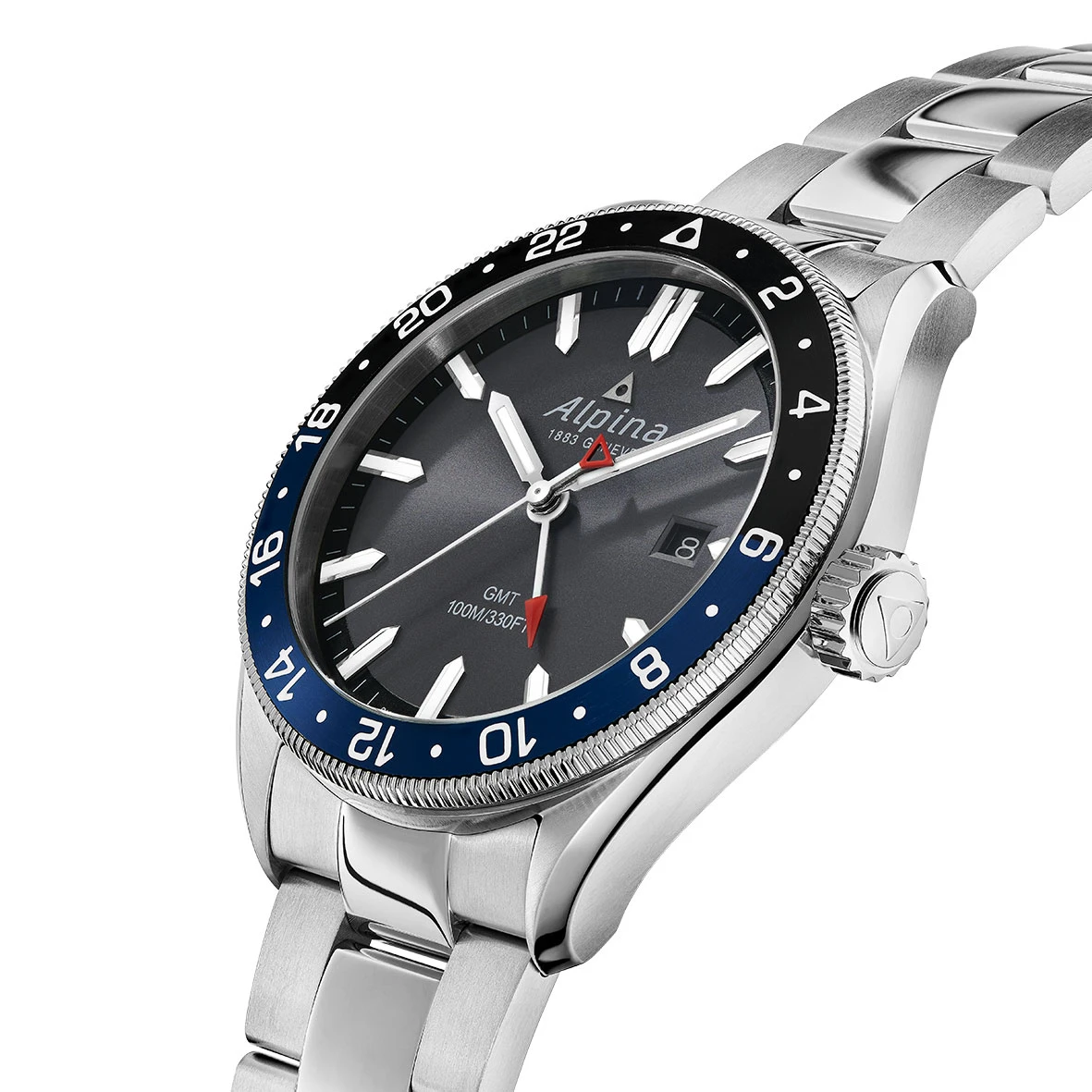 L’aiguille des secondes est blanche avec un triangle rouge, ajoutant une touche de dynamisme au cadran. L’aiguille GMT, de couleur blanche avec une flèche rouge, est un indicateur essentiel pour les voyageurs frĂ©quents.