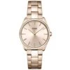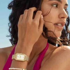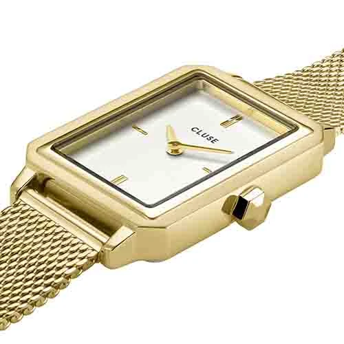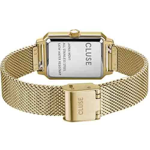 Elle est dotée d’un boîtier rectangulaire doré poli de 30,6 mm, d’un cadran blanc et d’un bracelet maille de 14 mm de couleur dorée.