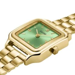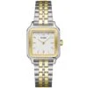 Elle est dotée d’un boîtier carré de 24 mm de couleur or et argent, d’un cadran blanc et d’un bracelet en acier inoxydable de 14 mm de couleur or et argent.