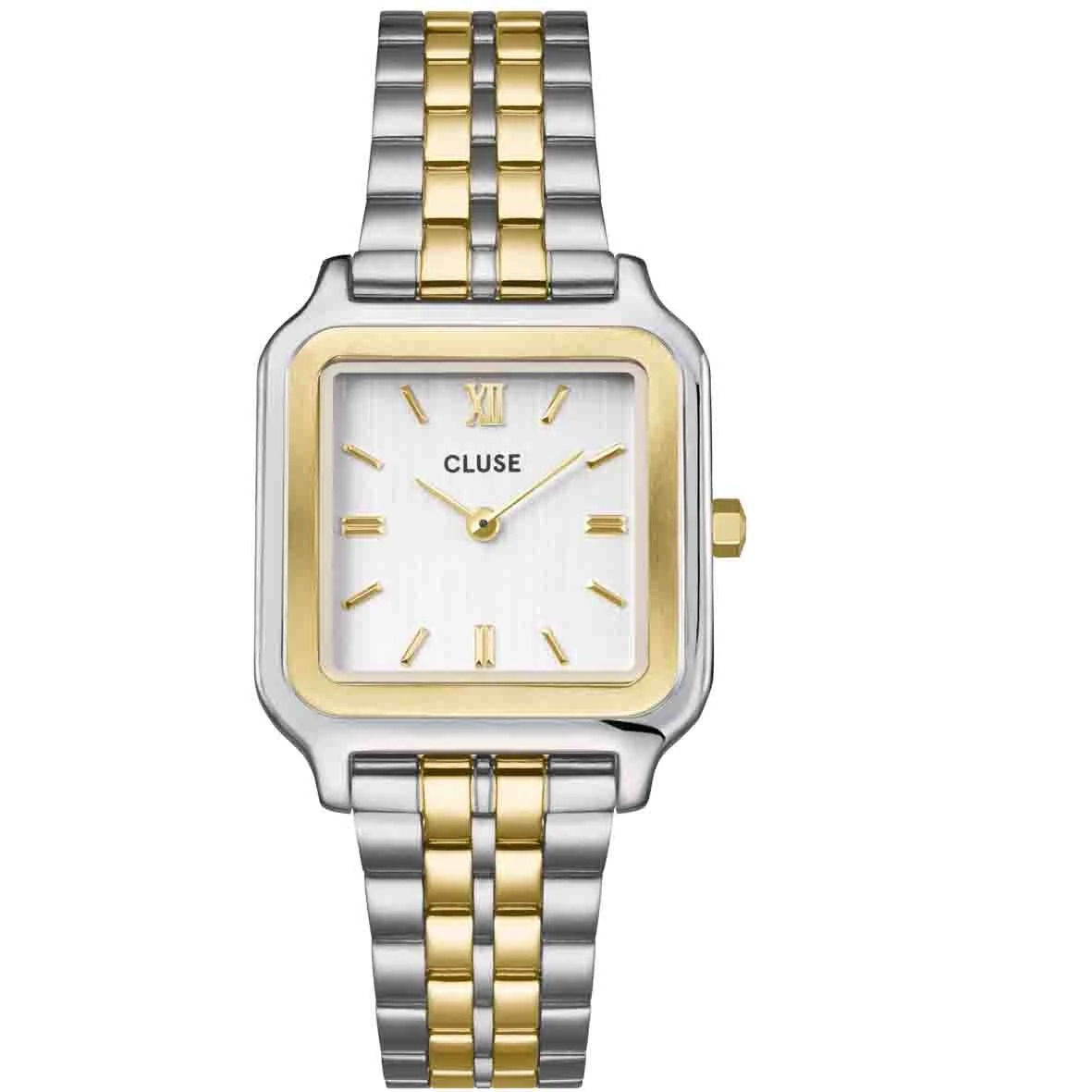 Elle se compose d’un boîtier carré de 28 mm de couleur or et argent, associé à un cadran blanc et à un bracelet en acier inoxydable or et argent de 16 mm.