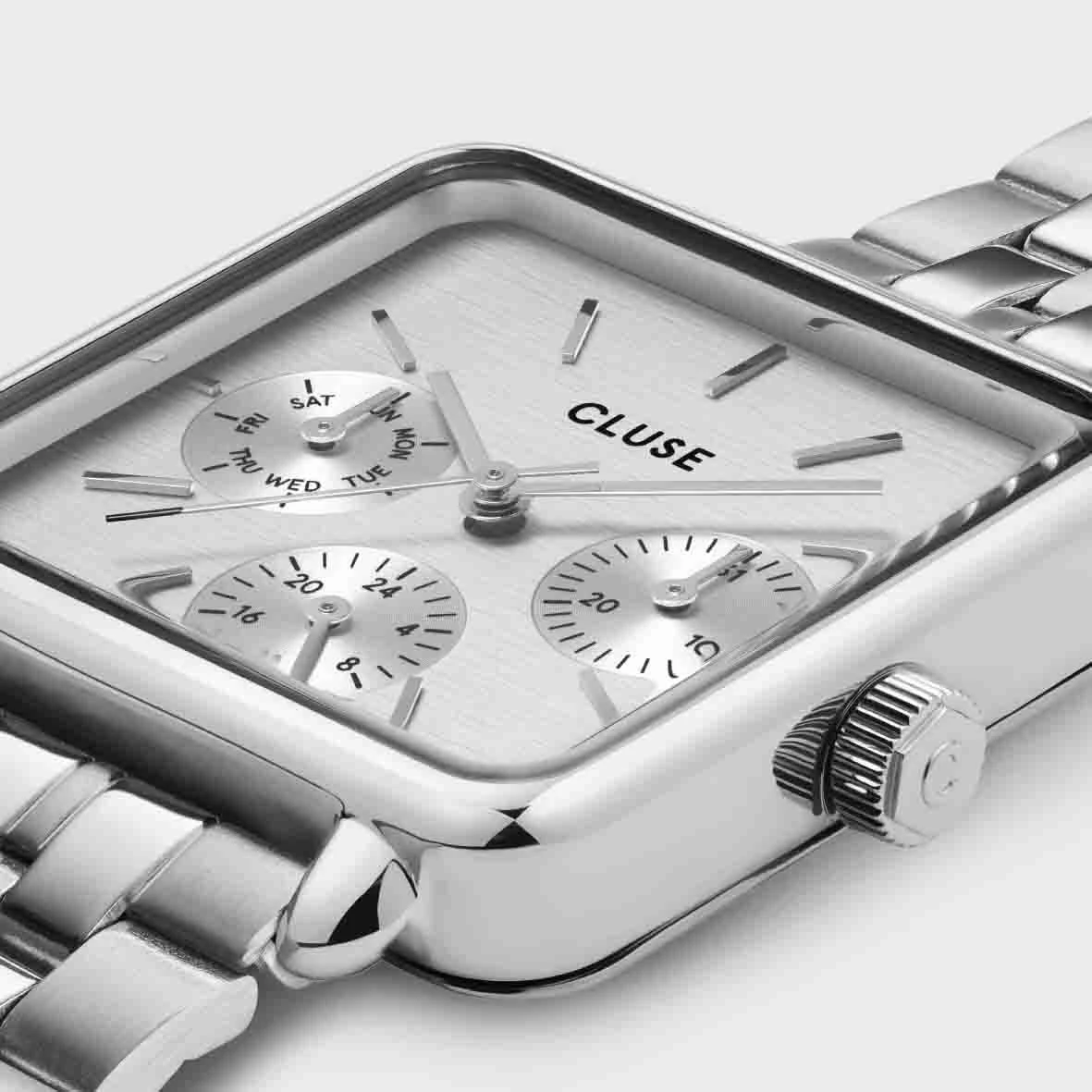 Arborant un boĂ®tier carrĂ© argentĂ© de 30 mm, un bracelet Ă 5 maillons et 3 sous-cadrans pour suivre le jour et l’heure, cette montre intĂ©gralement argentĂ©e ne se dĂ©mode jamais.
