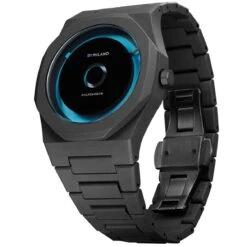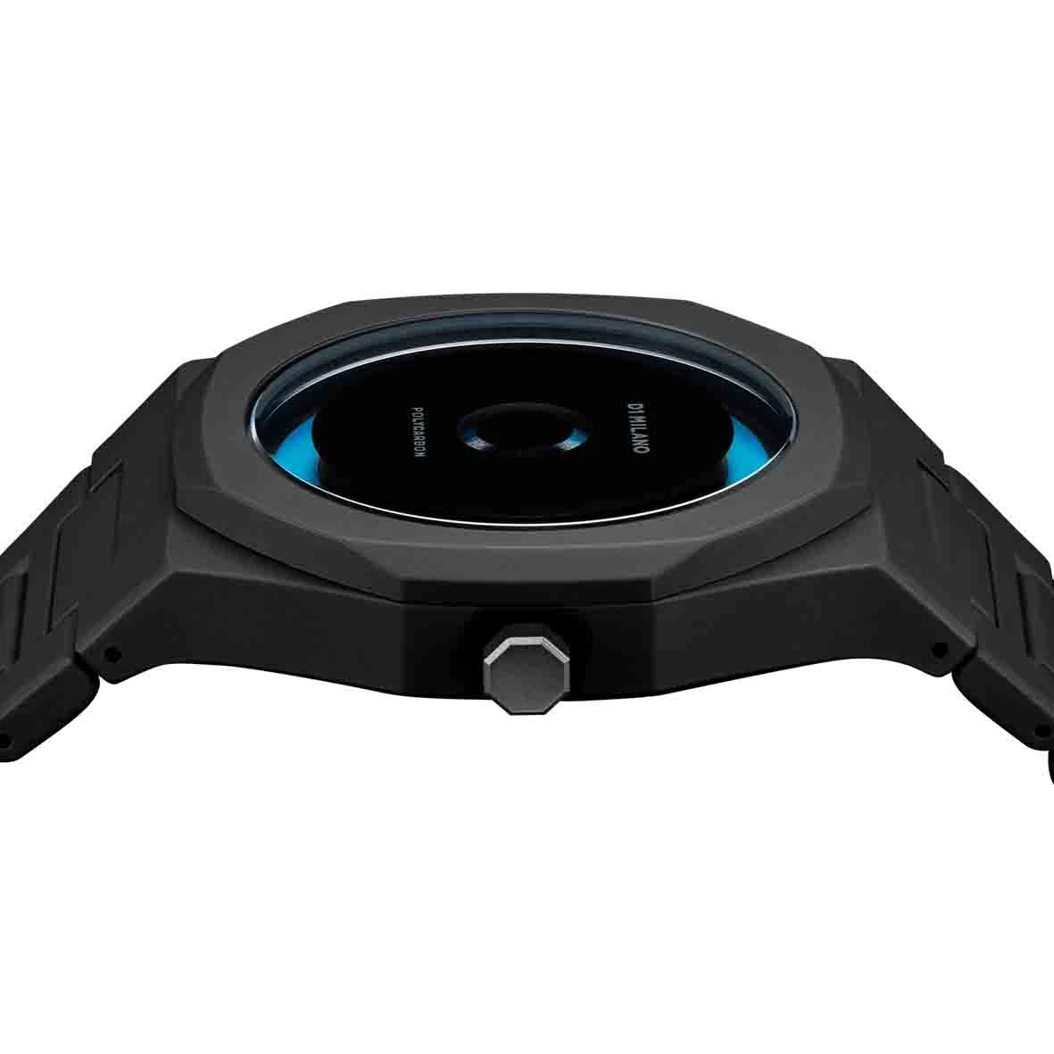 LumiNova bleu appliquĂ© sur l’anneau intĂ©rieur du cadran, le centre des aiguilles et la pointe de l’aiguille des minutes, fait briller un contraste net Ă travers la couche de verre imprimĂ©e et sur l’esthĂ©tique entièrement noire du polycarbonate construite par un polycarbonate doux au toucher. boĂ®tier, lunette et bracelet.