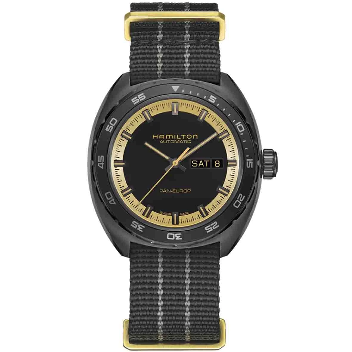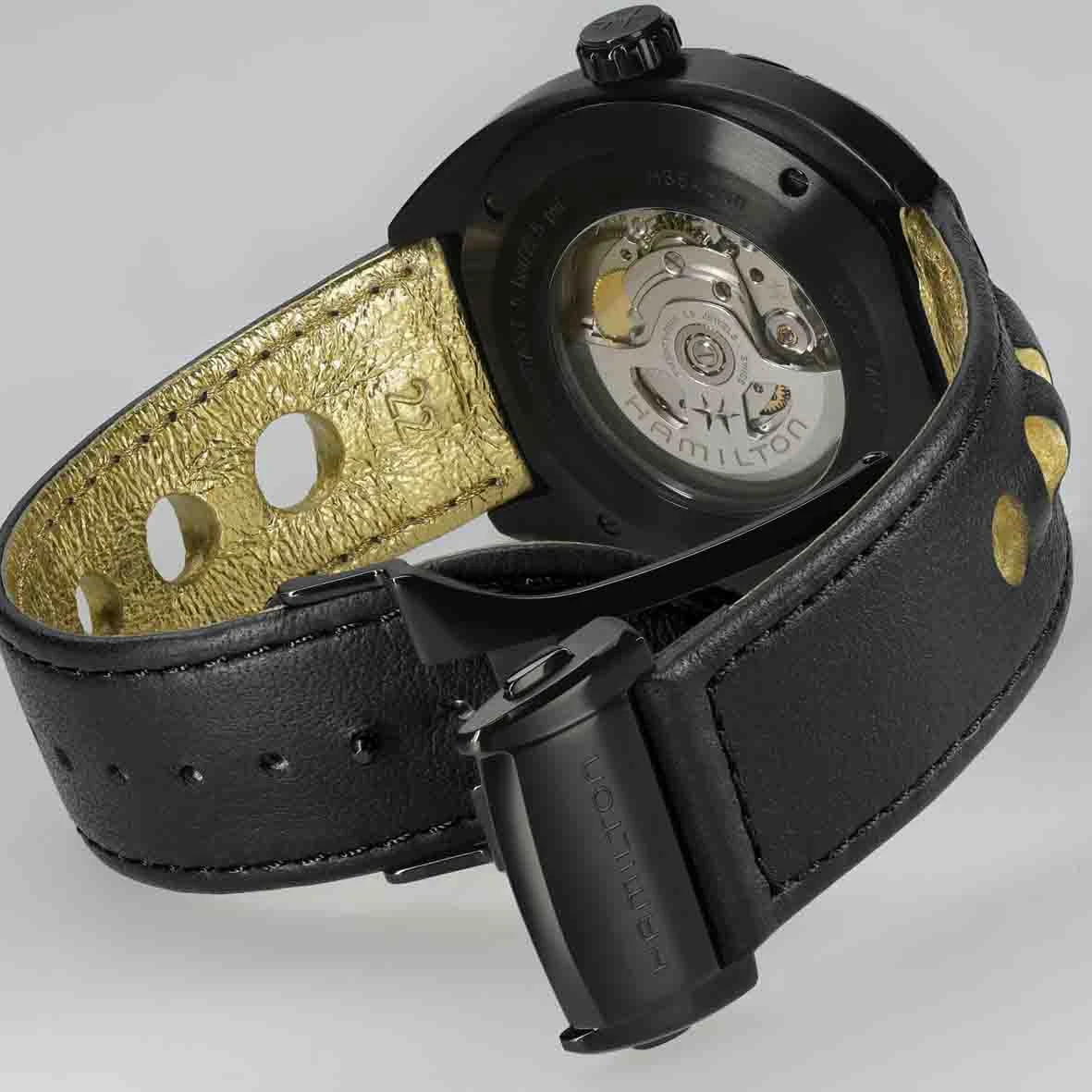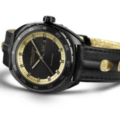 Brillez de mille feux avec ce design bicolore. Incarnant le mystère et le glamour hollywoodien, notre concept noir et or se compose de cinq célèbres montres : Jazzmaster Auto 36 mm, Jazzmaster Auto Chrono 42 mm, Pan Europ, Ventura Chrono Quartz et Ventura S.