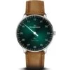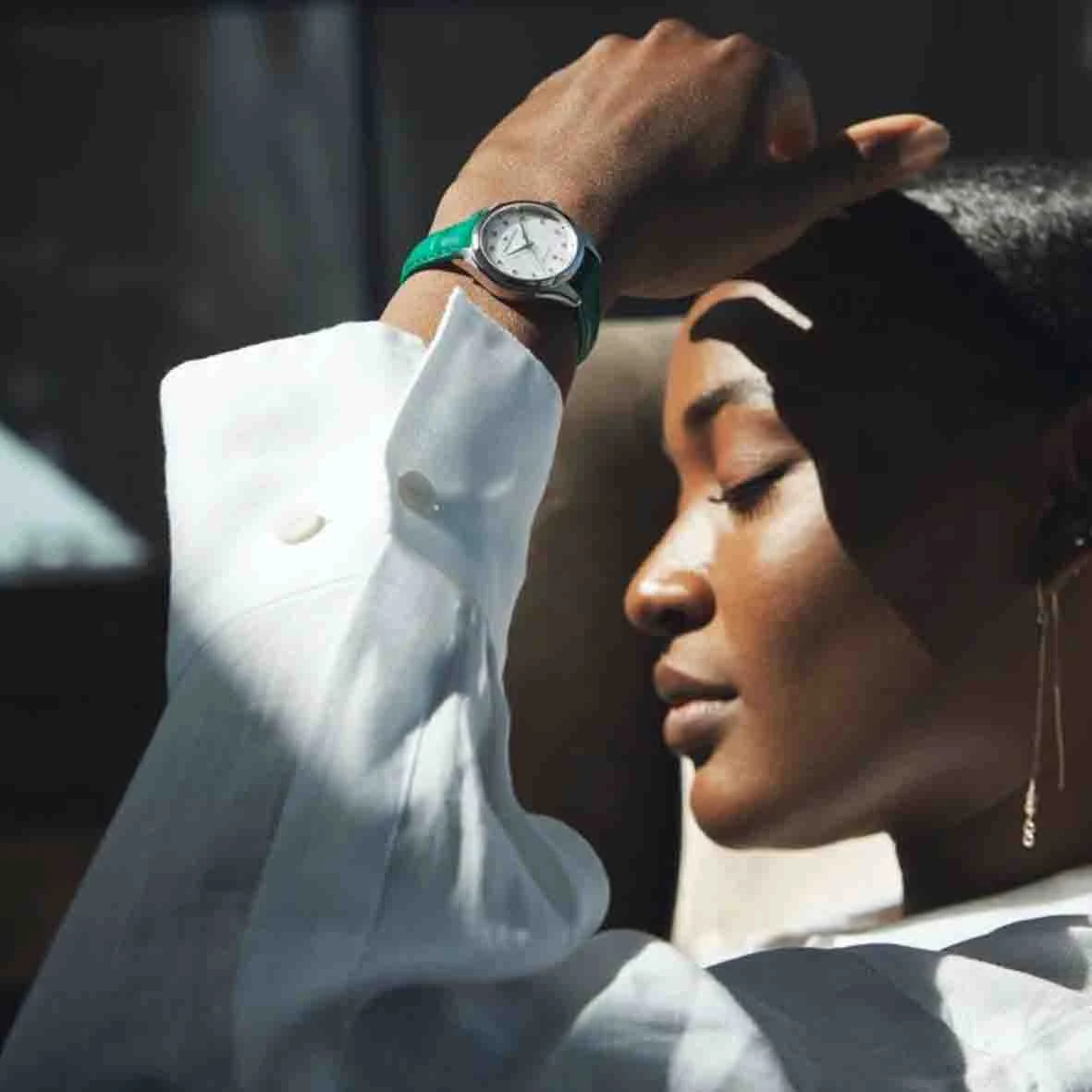 Le charisme de notre Jazzmaster Lady Auto est instantanément rehaussé grâce à ce magnifique bracelet en cuir vert effet alligator.
