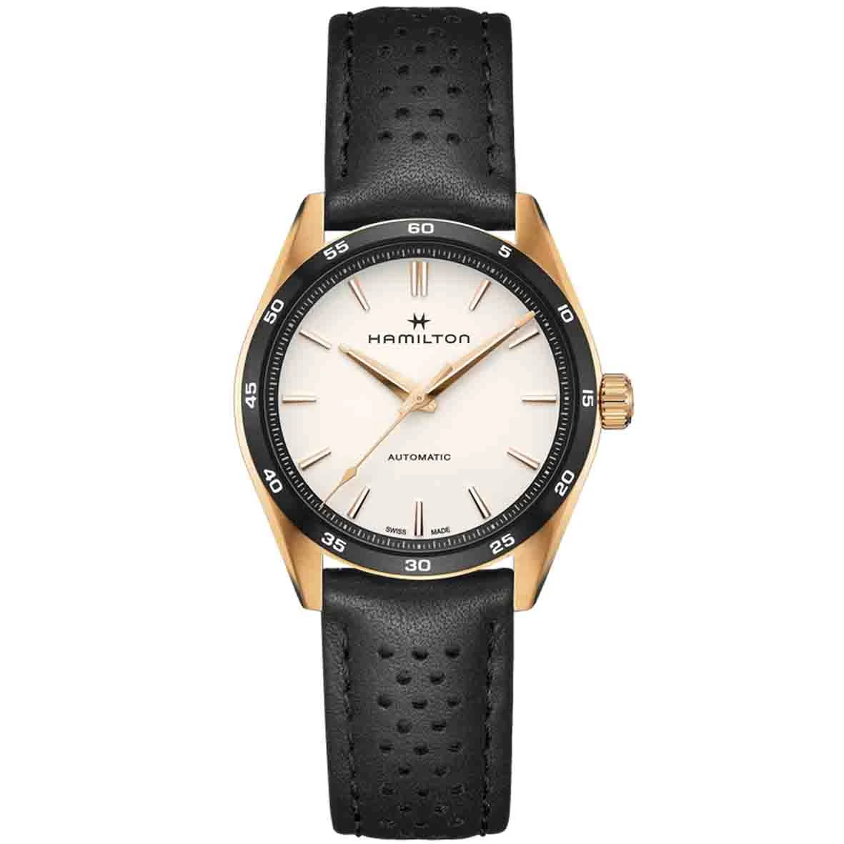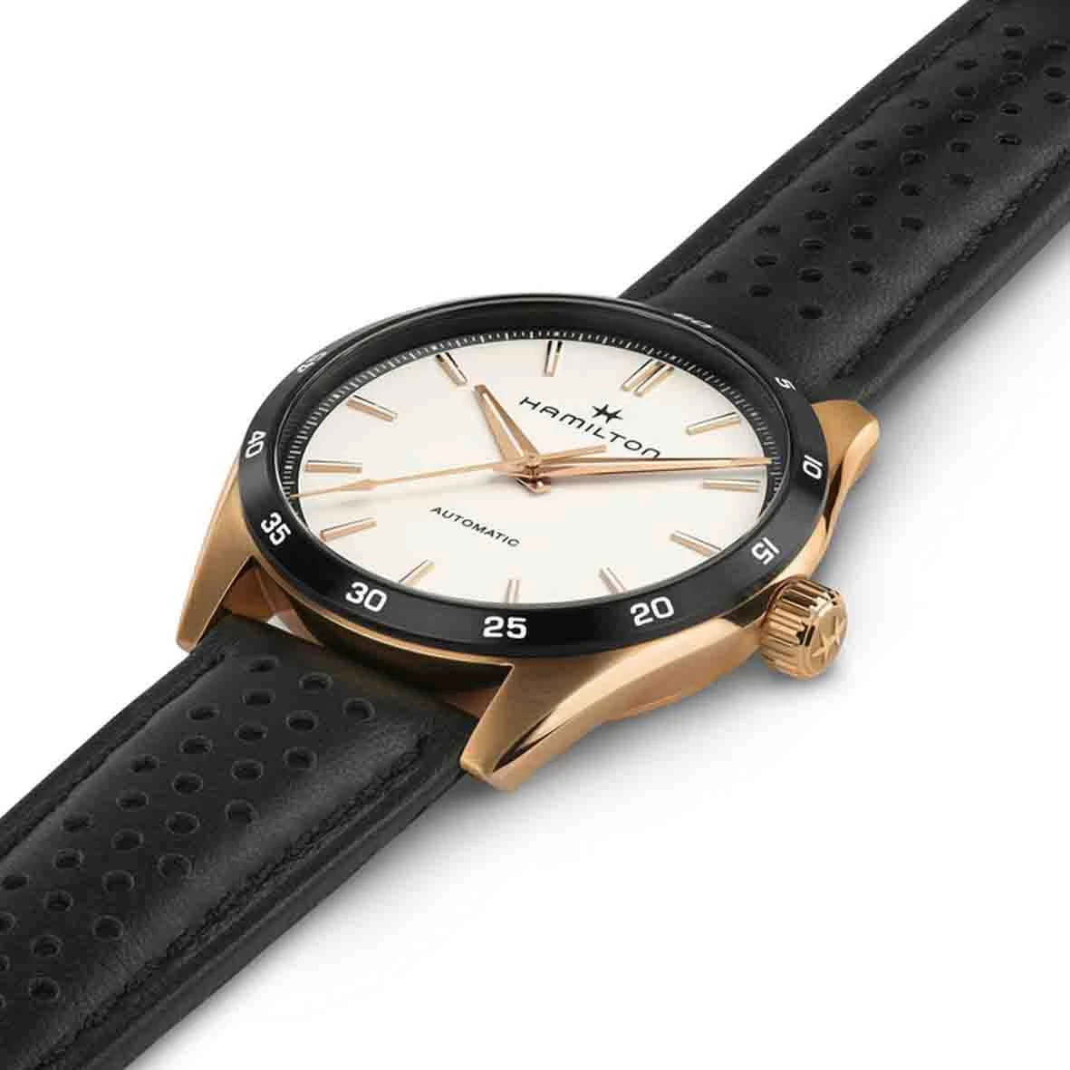 AnimĂ©e par le mouvement automatique H-10 avec une rĂ©serve de marche de 80 heures, cette Jazzmaster Performer Automatic prĂ©sente un boĂ®tier de 38 mm en acier inoxydable avec revĂŞtement PVD or rose, rehaussĂ© d’un cadran blanc minimaliste et d’un bracelet en cuir noir perforĂ© style sport assorti Ă la lunette.
