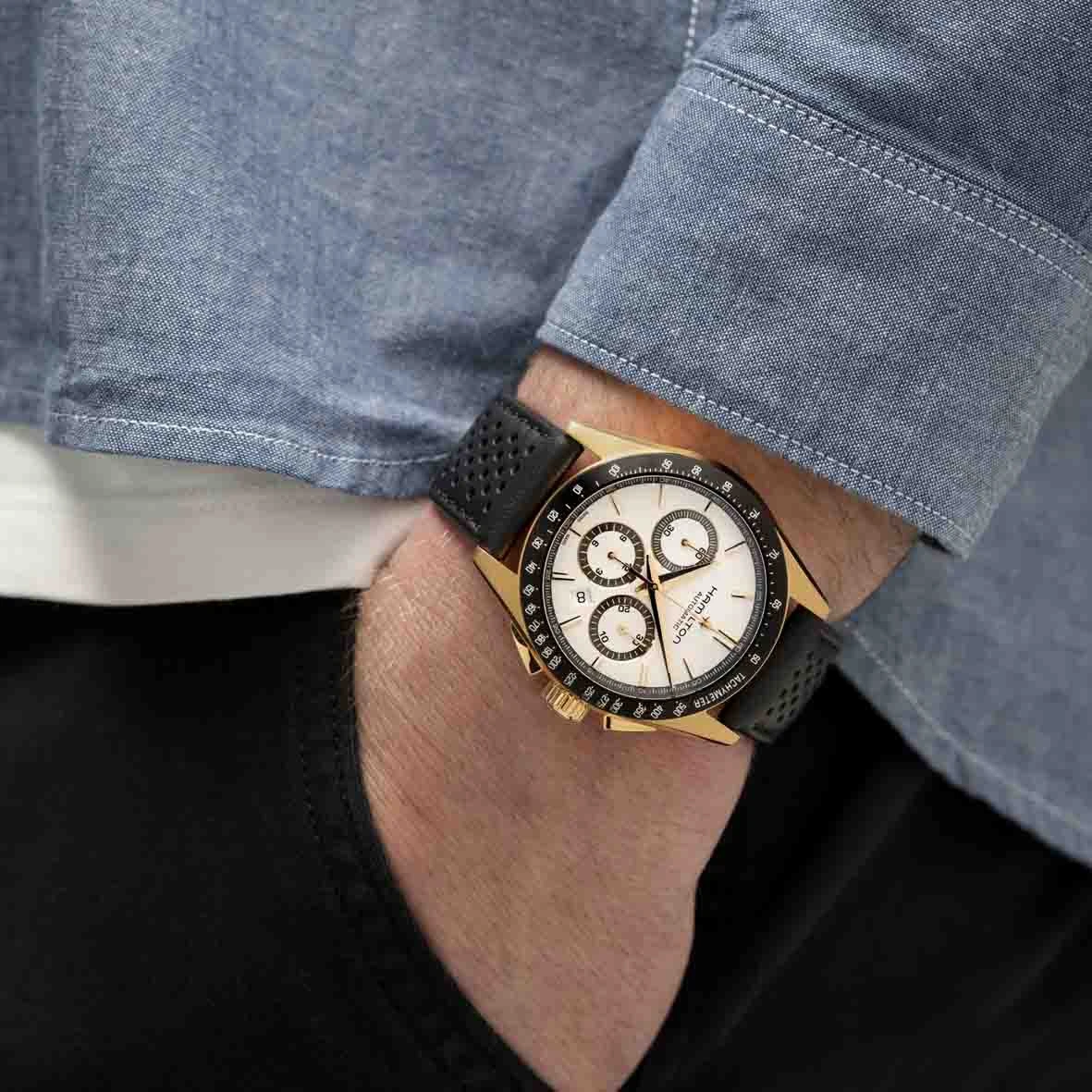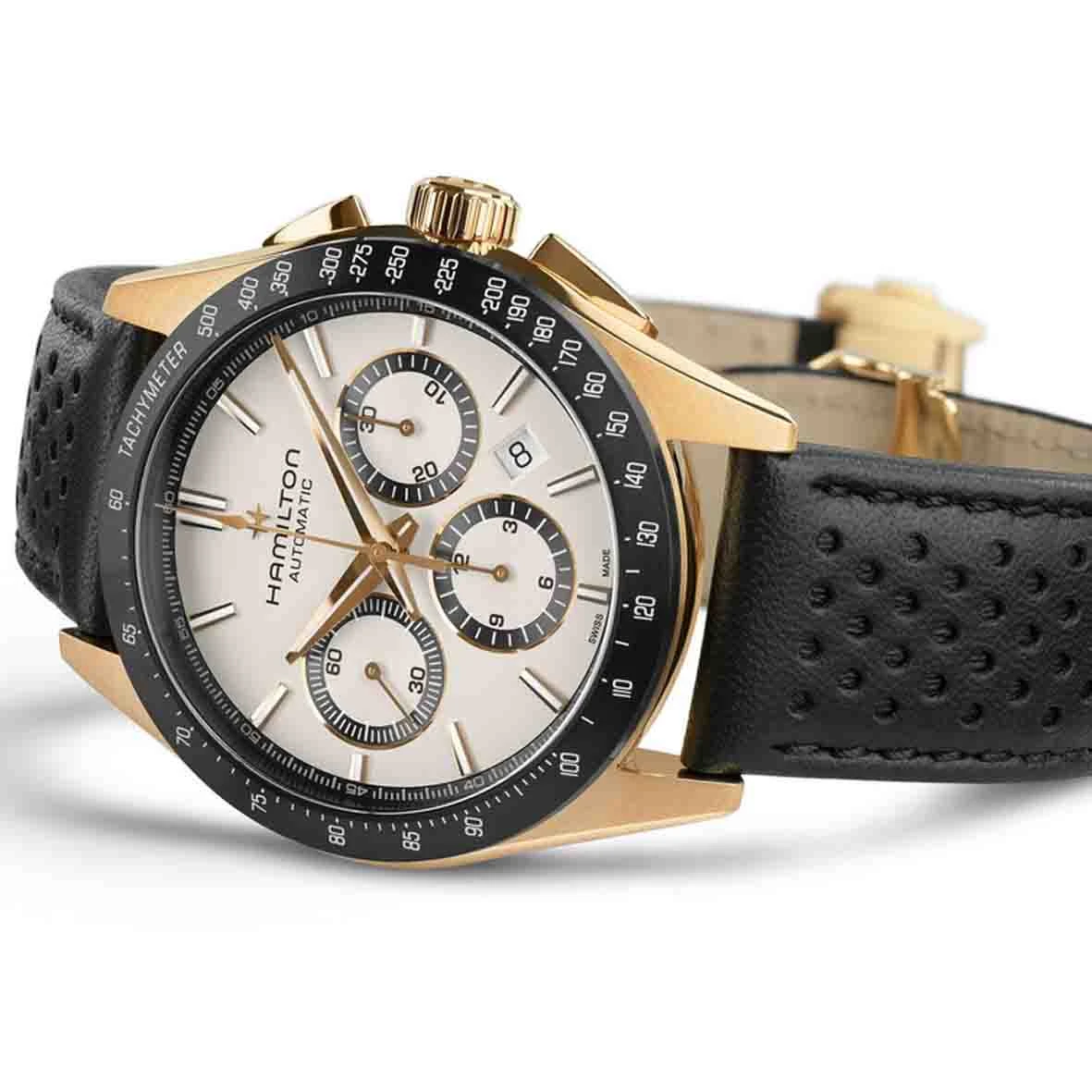 Conçues pour les amateurs de fonctionnalitĂ© et de style, les montres Jazzmaster Performer offrent une allure sport chic affirmĂ©e. AnimĂ©e par le mouvement chronographe automatique H-31 avec une rĂ©serve de marche de 60 heures, cette Jazzmaster Performer Automatic Chronograph prĂ©sente un boĂ®tier de 42 mm en acier inoxydable avec revĂŞtement PVD or rose, rehaussĂ© d’un cadran blanc sobre et d’un bracelet en cuir noir perforĂ© style sport assorti Ă la lunette.
