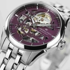 Précision est le maître mot de la Jazzmaster Skeleton 36 mm, qui révèle la subtile beauté de ses mécanismes internes à travers son cadran violet ajouré.