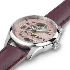 Précision est le maître mot de la Jazzmaster Skeleton 36 mm, gratifiée d’un cadran rose ajouré qui révèle la subtile beauté de ses mécanismes internes.