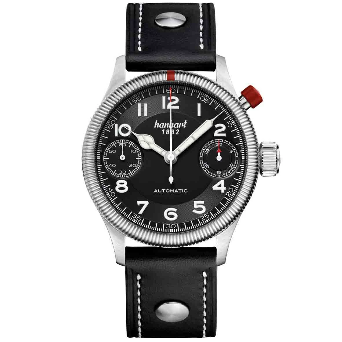 Au premier coup d’Ĺ“il, les caractĂ©ristiques distinctives d’un chronographe Hanhart classique sont immĂ©diatement apparentes : la disposition asymĂ©trique des boutons, le bouton de remise Ă zĂ©ro rouge et, selon le modèle, la lunette tournante cannelĂ©e et le bracelet en cuir intemporel avec rivetage satinĂ©.