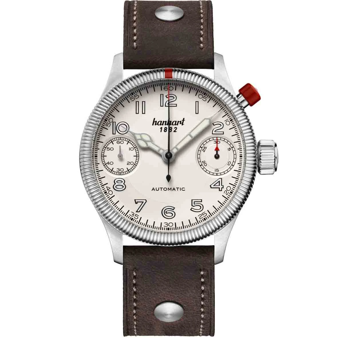 Au premier coup d’Ĺ“il, les caractĂ©ristiques distinctives d’un chronographe Hanhart classique sont immĂ©diatement apparentes : la disposition asymĂ©trique des boutons, le bouton de remise Ă zĂ©ro rouge et, selon le modèle, la lunette tournante cannelĂ©e et le bracelet en cuir intemporel avec rivetage satinĂ©.