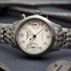Au premier coup d’Ĺ“il, les caractĂ©ristiques distinctives d’un chronographe Hanhart classique sont immĂ©diatement apparentes : la disposition asymĂ©trique des boutons, le bouton de remise Ă zĂ©ro rouge et, selon le modèle, la lunette tournante cannelĂ©e et le bracelet en cuir intemporel avec rivetage satinĂ©.