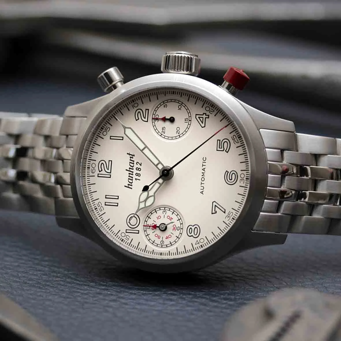 Cette combinaison unique d’Ă©lĂ©ments de design traditionnels et de qualitĂ© de construction moderne est incarnĂ©e dans chaque montre Hanhart PIONEER.