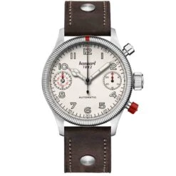 Au premier coup d’Ĺ“il, les caractĂ©ristiques distinctives d’un chronographe Hanhart classique sont immĂ©diatement apparentes : la disposition asymĂ©trique des boutons, le bouton de remise Ă zĂ©ro rouge et, selon le modèle, la lunette tournante cannelĂ©e et le bracelet en cuir intemporel avec rivetage satinĂ©.