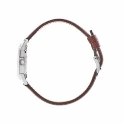 Le cadran de couleur argentĂ© est dotĂ© d’index triangulaires en relief.