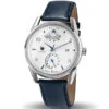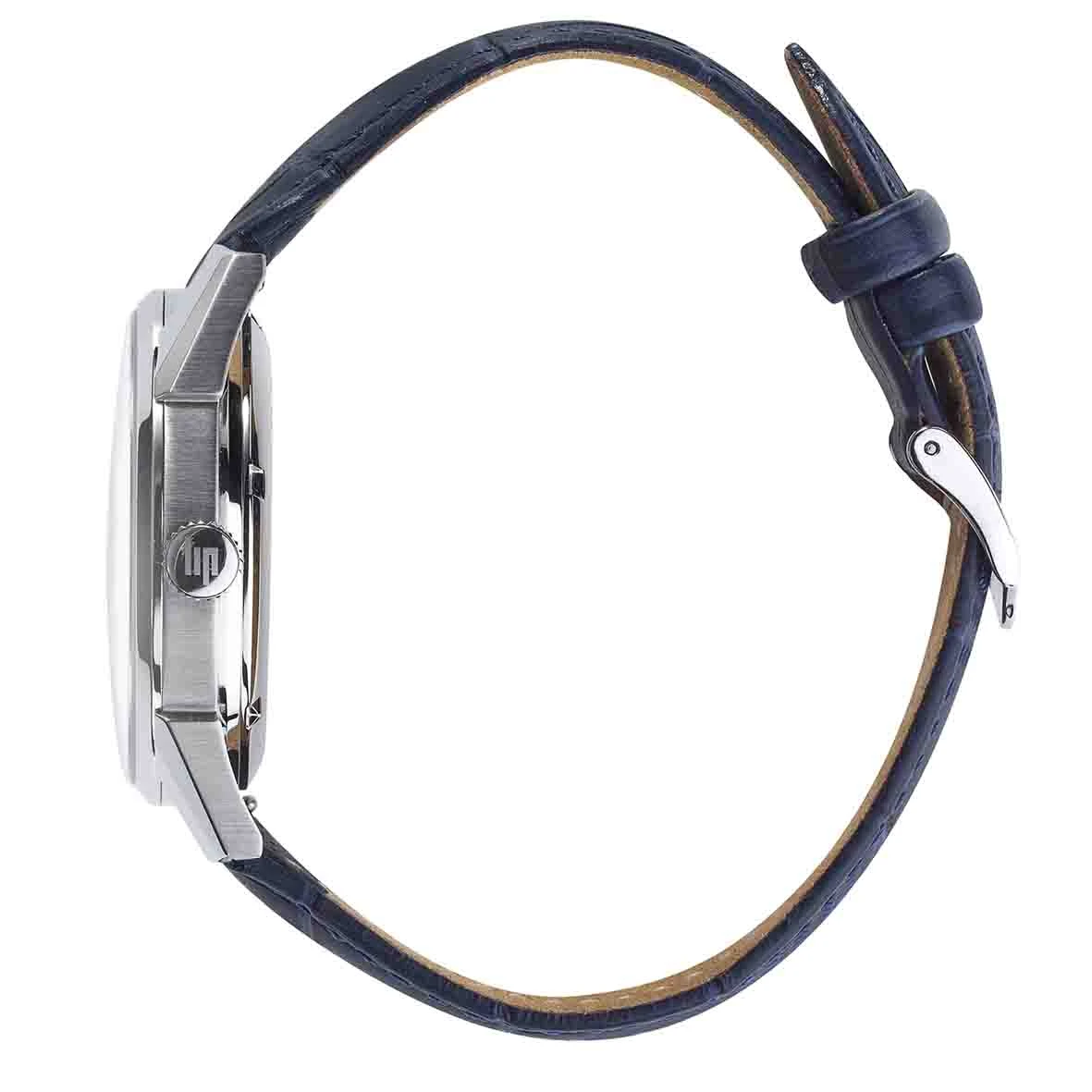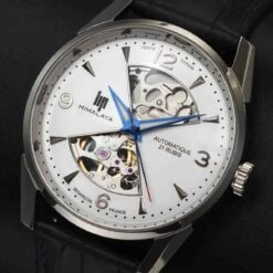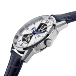Cadran – blanc argentĂ© avec index chiffres arabes et bâtons argentĂ©s, aiguilles heure et minute bleues luminescentes, trotteuse bleue extrĂ©mitĂ© rouge, cadran ouvert en forme de sablier pour admirer le balancement du mouvement