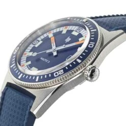 Cadran – bleu, index bâtons blancs, index des heures bâtons et 3 chiffres arabes (6, 9, 12) argentĂ©s oranges et luminescents, aiguilles heures et minutes argentĂ©es extrĂ©mitĂ©s oranges avec luminescence, trotteuse argentĂ©e avec motif rond luminescent, lunette extĂ©rieure rotative noire avec index argentĂ©s, date Ă 3h