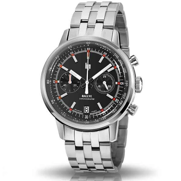 noir, index bâtons blancs, graduations tachymètre blanches, dateur à 6h, compteurs du mode 24h à 3h et compteur des minutes du chronographe à 9h, aiguilles heures et minutes blanches luminescentes, mention du nom Rallye inscrite à 6h