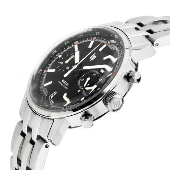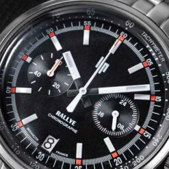 base mécanique avec start/stop net et franc, ainsi qu’une remise à zéro instantanée. Aiguille centrale blanche avec mesure au 1/5 ème de seconde. Compteur des minutes à 9h