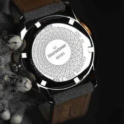 Le boîtier fin en acier inoxydable de la Neo mesure 36 millimètres de diamètre et est étanche jusqu’à 50 mètres. Le dos est gravé du point d’orgue, qui est le logo MeisterSinger d’inspiration musicale. Le cadran, lui, indique le nom de ce modèle dit « Vintage Edition ».