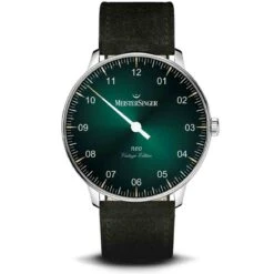 Mais la Neo Vintage, en édition limitée pour la France, a un design plus jeune et est une véritable MeisterSinger de part en part, avec sa mono aiguille et des marqueurs des heures à deux chiffres tout autour dans une typographie fonctionnelle et un look vintage.