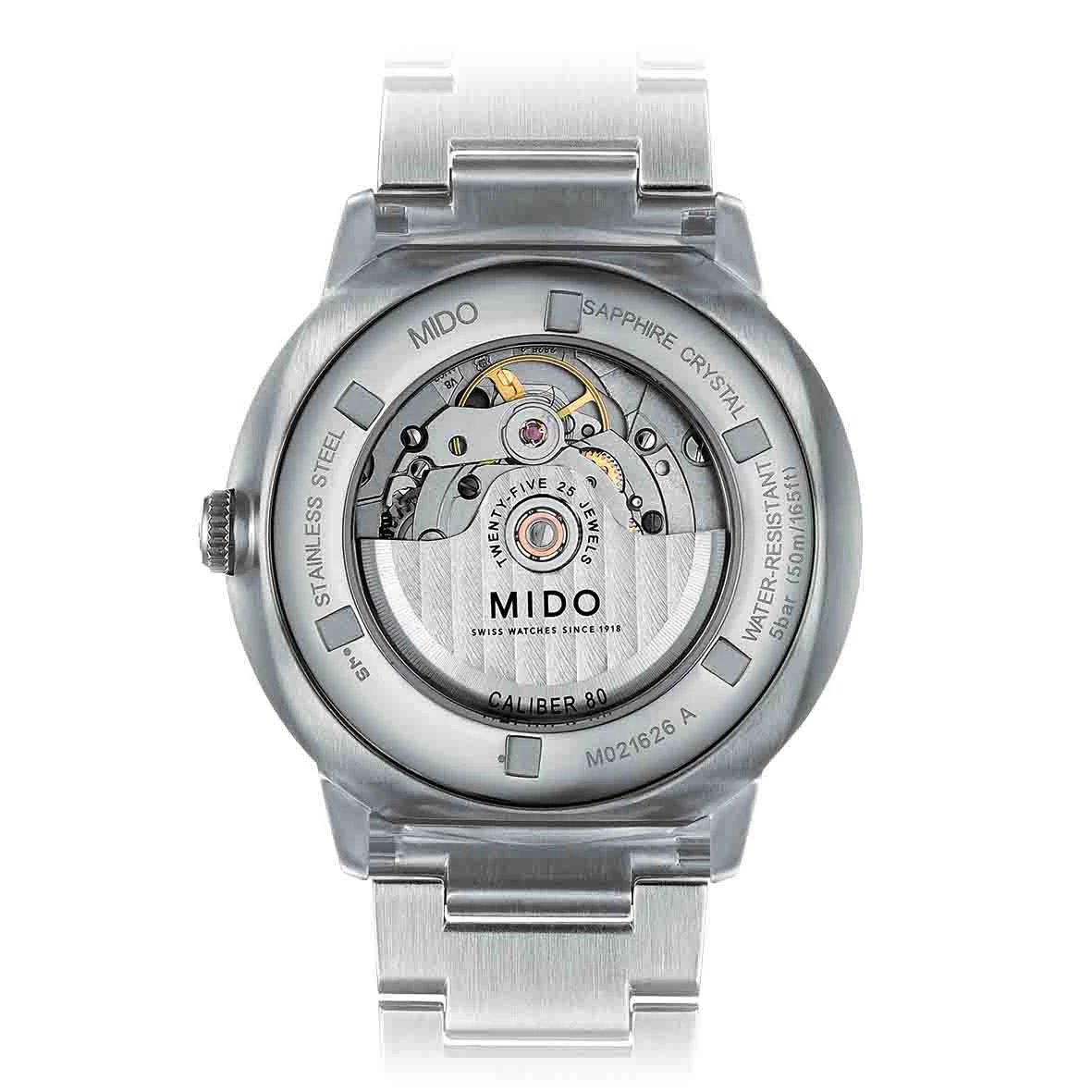 Finement décoré avec une masse oscillante ornée de côtes de Genève et du logo MIDO, le mouvement peut être observé à travers le fond de boîte en glace saphir de la Commander Big Date et de la Baroncelli Big Date.