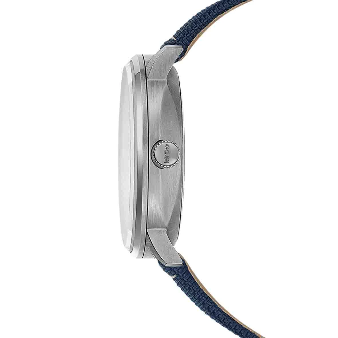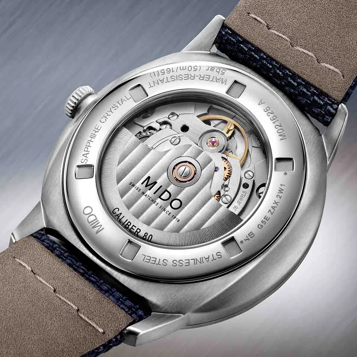 Finement décoré avec une masse oscillante ornée de côtes de Genève et du logo MIDO, le mouvement peut être observé à travers le fond de boîte en glace saphir de la Commander Big Date et de la Baroncelli Big Date.