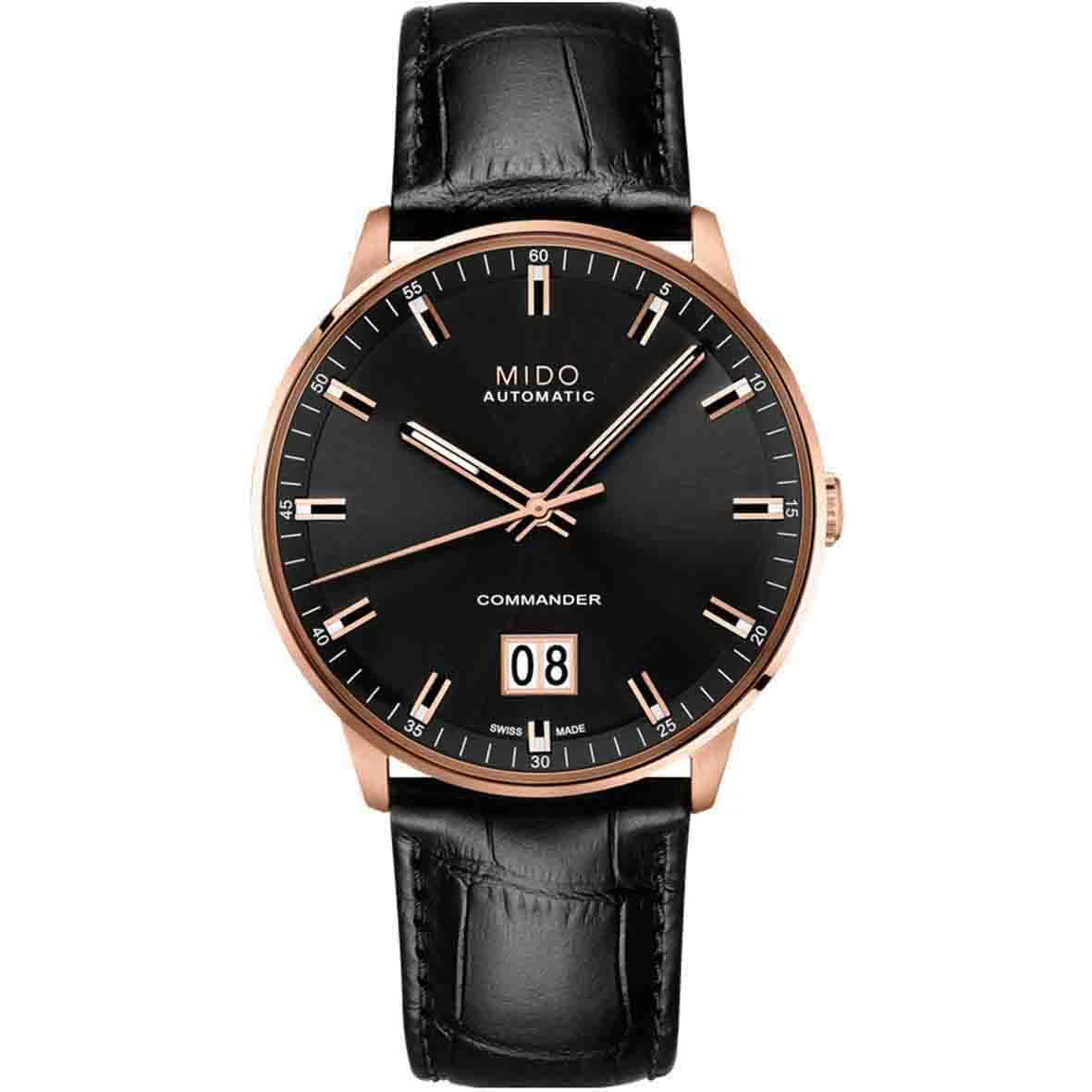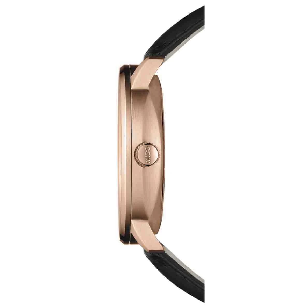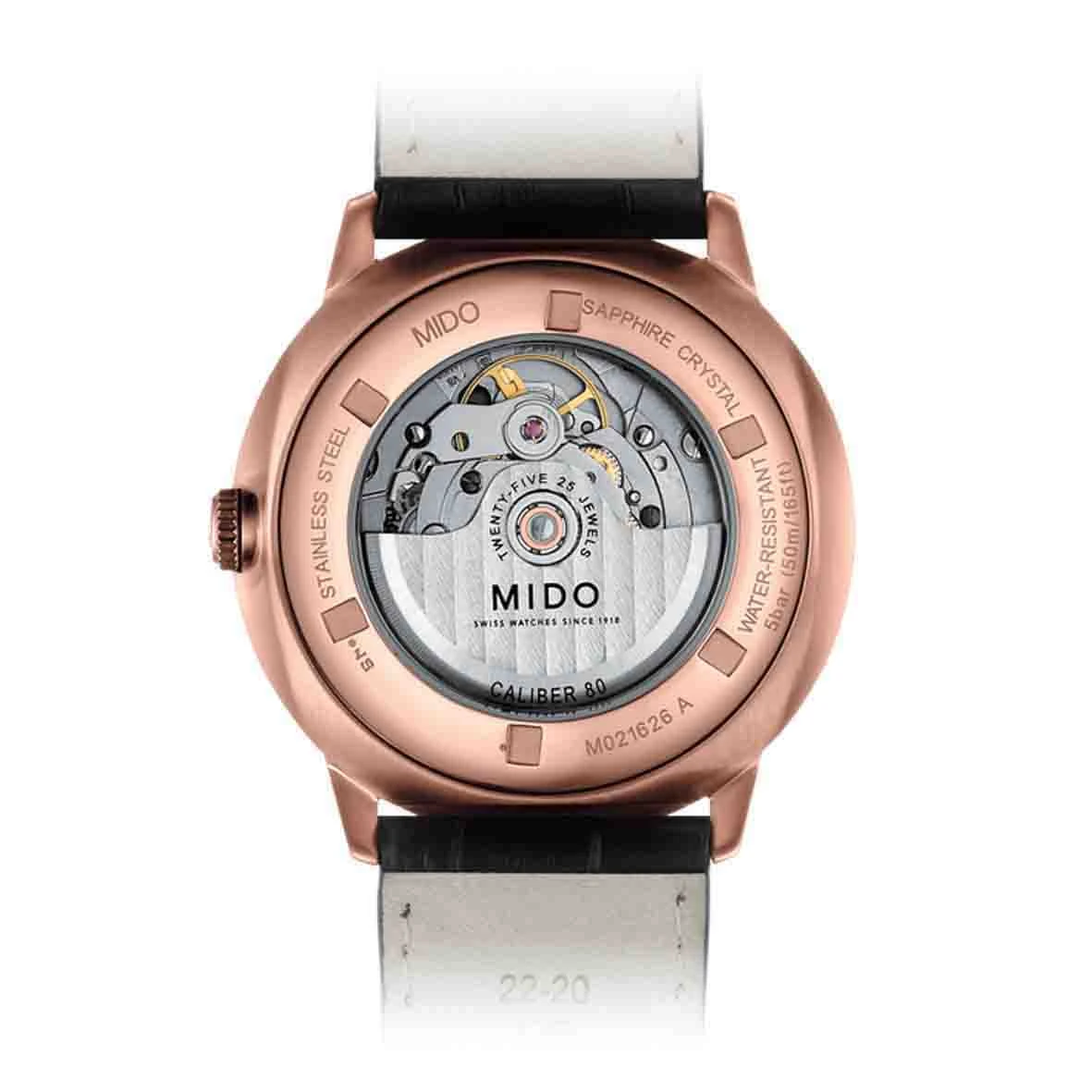 Finement décoré avec une masse oscillante ornée de côtes de Genève et du logo MIDO, le mouvement peut être observé à travers le fond de boîte en glace saphir de la Commander Big Date et de la Baroncelli Big Date.