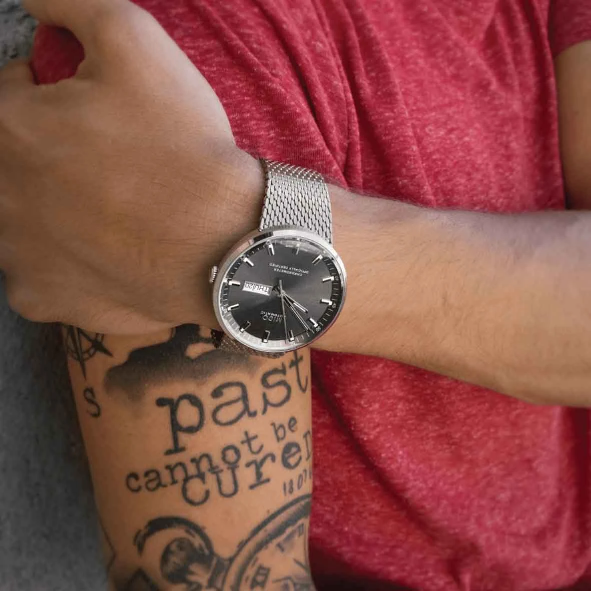 Son design néo-vintage reprend l’essentiel des codes qui ont fait le succès de la Commander: des lignes d’une grande pureté, l’espace maximal laissé au superbe cadran satiné soleil, sans oublier le bracelet à maille milanaise.