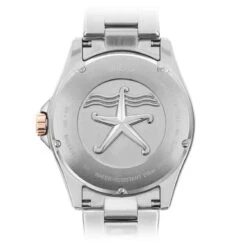 En effet, ce garde-temps est étanche jusqu’à 20 bar. Les formes de la boîte protègent la couronne, tandis que le fond de boîte est gravé du logo Ocean Star.
