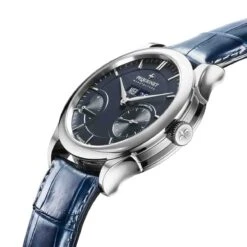Vous trouverez Ă©galement un affichage de la date et du jour sous l’index Ă 12 heures, complĂ©tĂ© par un bracelet marron perlĂ© en alligator Ă grandes Ă©cailles.