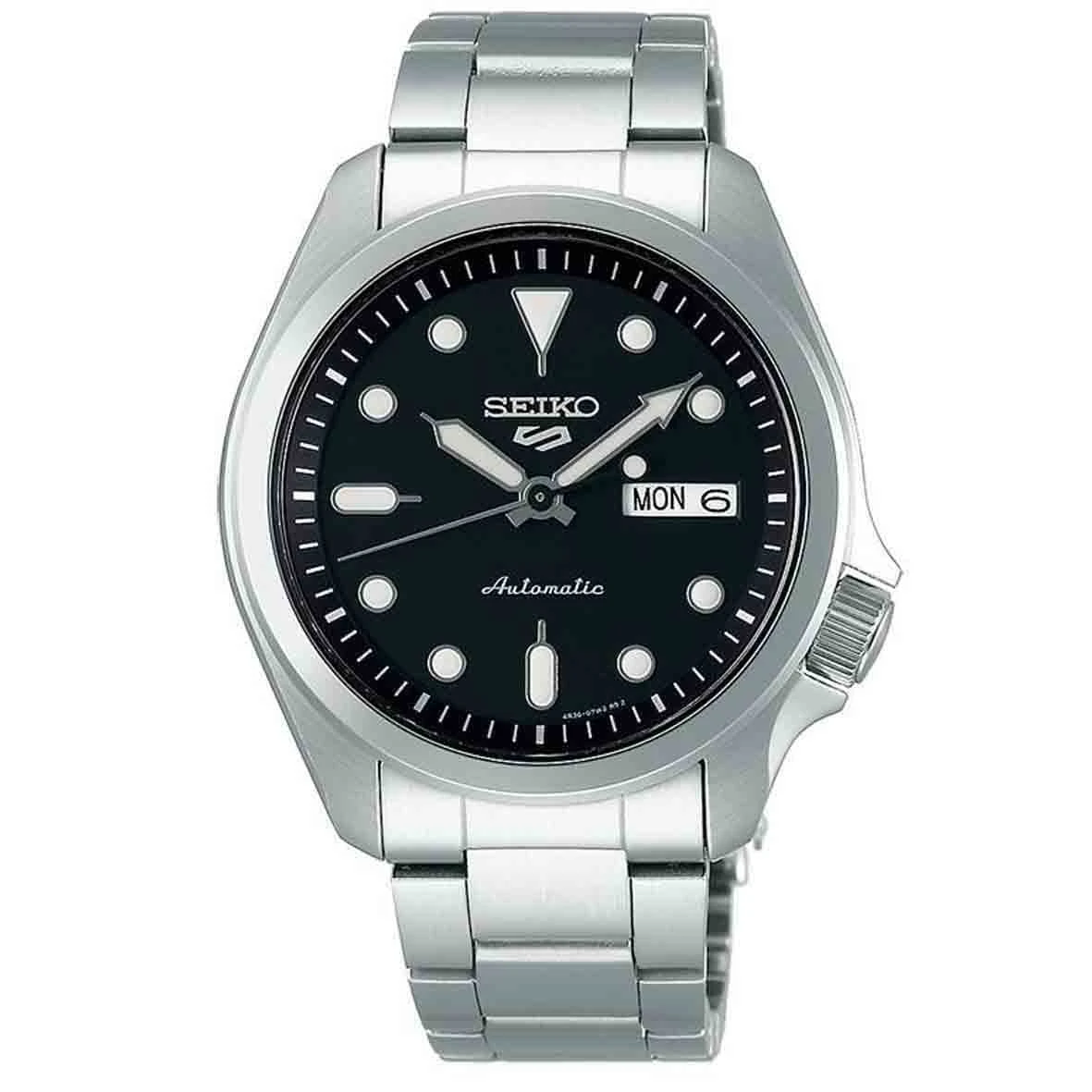 Entièrement en acier inoxydable, ce garde-temps est Ă©quipĂ© d’un mouvement automatique 3 aiguilles et accueille Ă 3h un affichage jour/date et Ă 12h le nouveau logo de la collection Seiko 5.