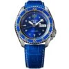AnimĂ©e par un calibre automatique de manufacture Seiko, cette montre en acier inoxydable est Ă©tanche 10 bar et dispose d’un fond de boĂ®te transparent.