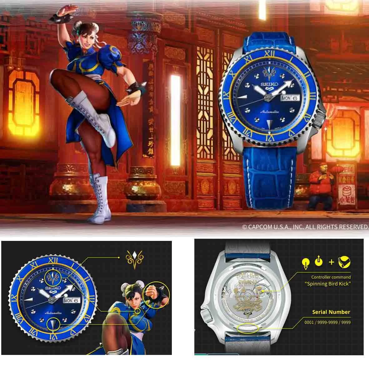 Le motif de dragon sur sa ceinture est imprimé sur la doublure du bracelet et la commande de son coup spécial « Spinning Bird Kick » sur le fond du boîtier.
