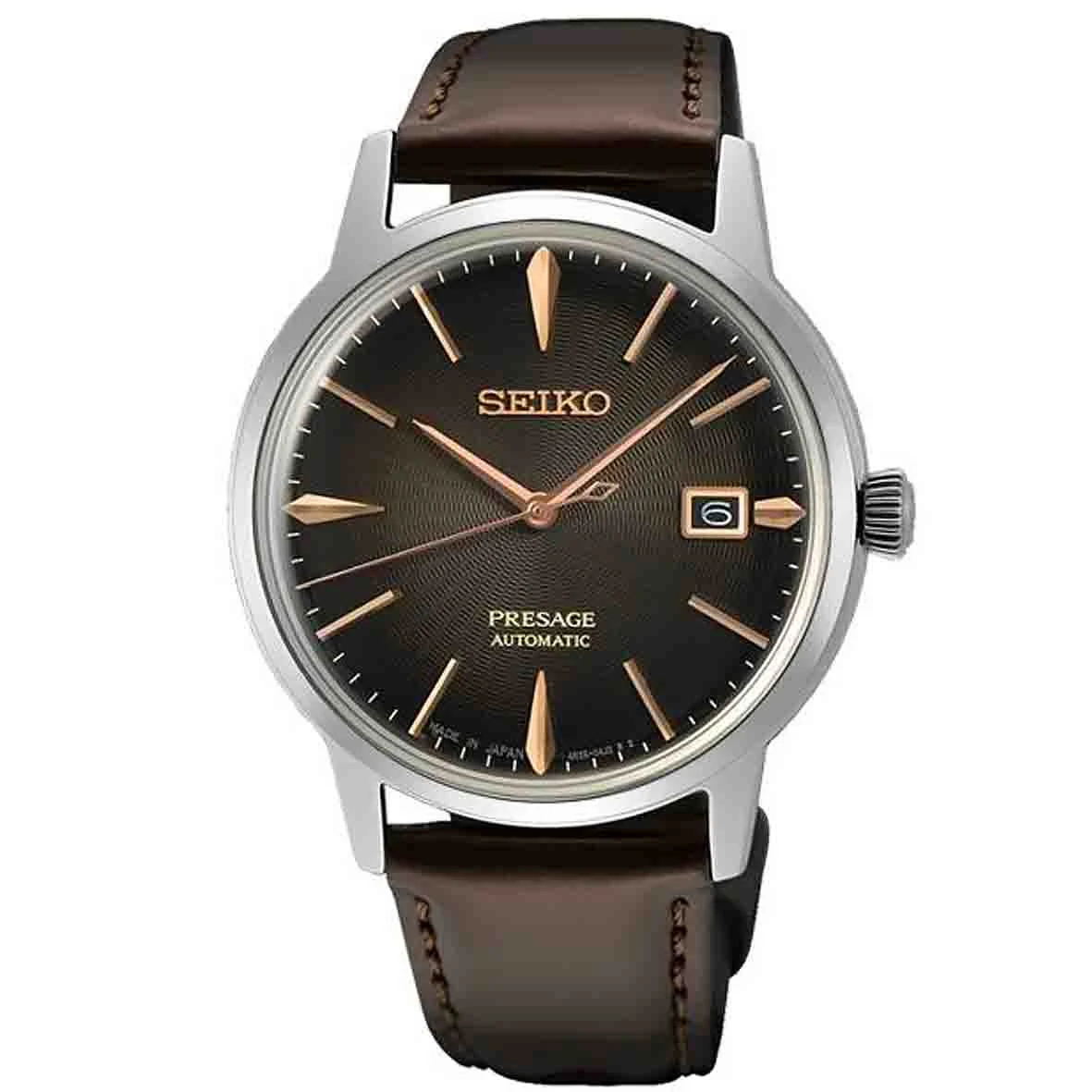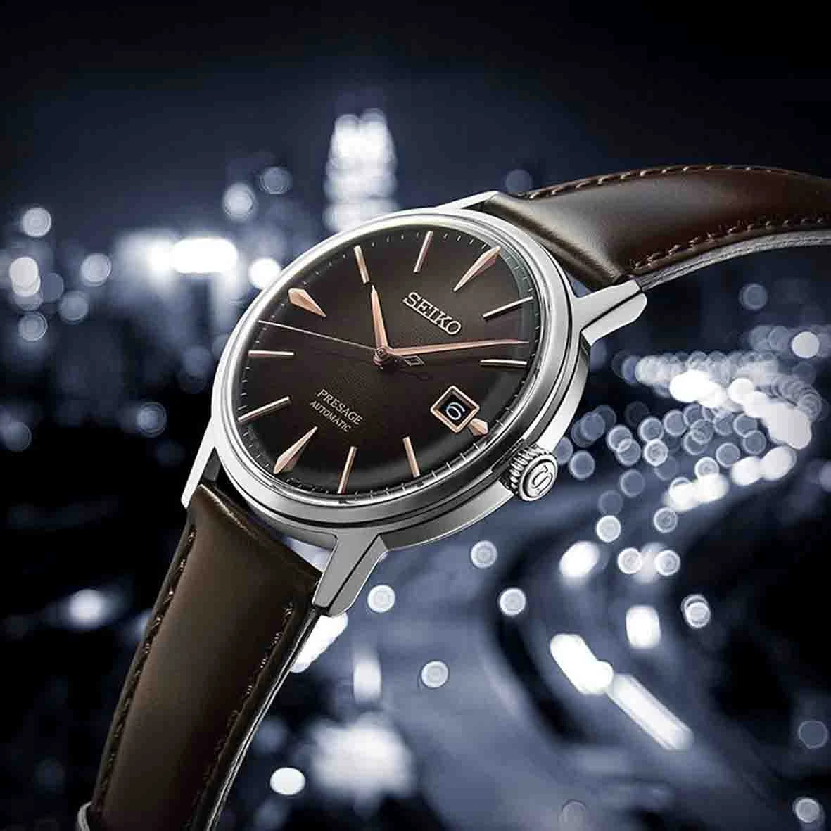 La montre SRPJ17J1 de la collection Presage Cocktail est facilement reconnaissable à son cadran marron texturé.